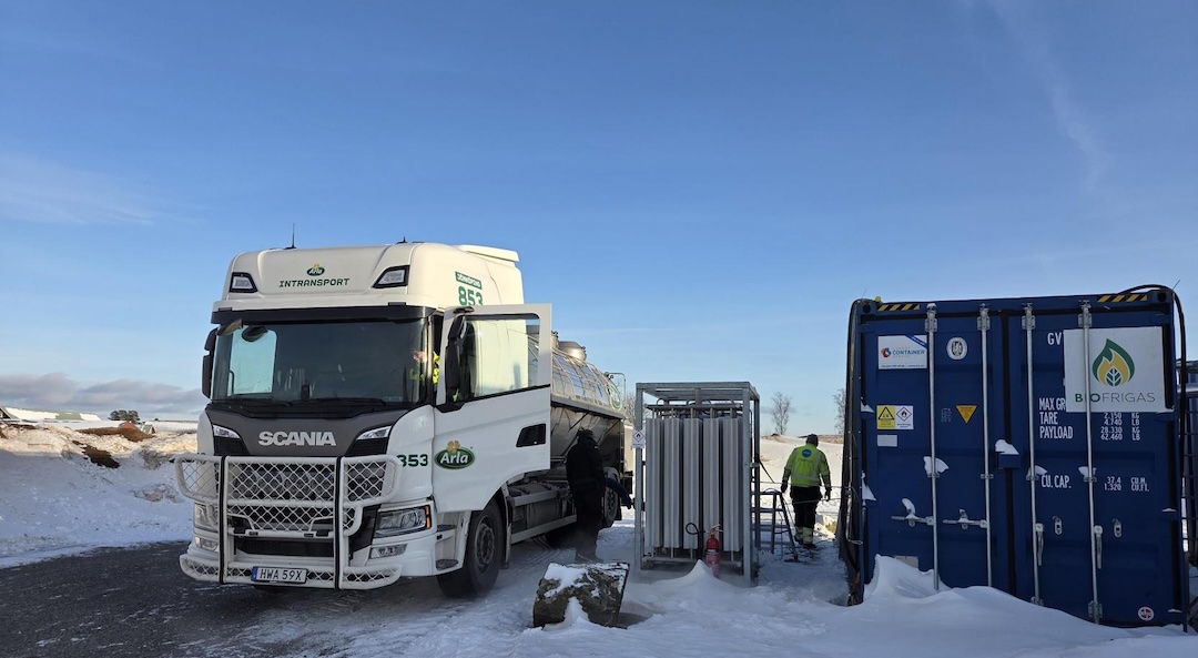Biofrigas anläggning tankar Arlas mjölkbil med gårdsbaserad flytande biogas